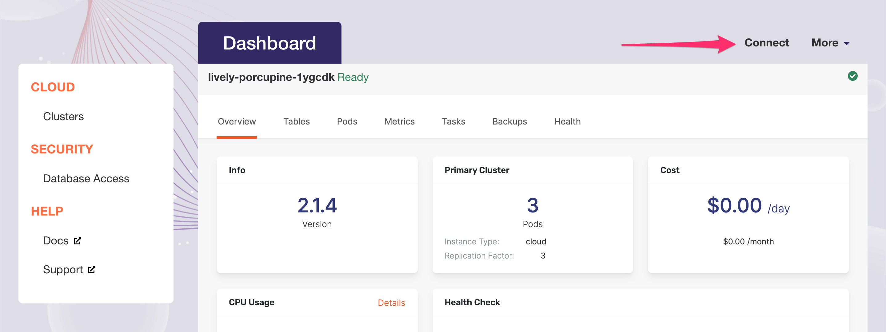 On your cluster’s dashboard, click on Connect