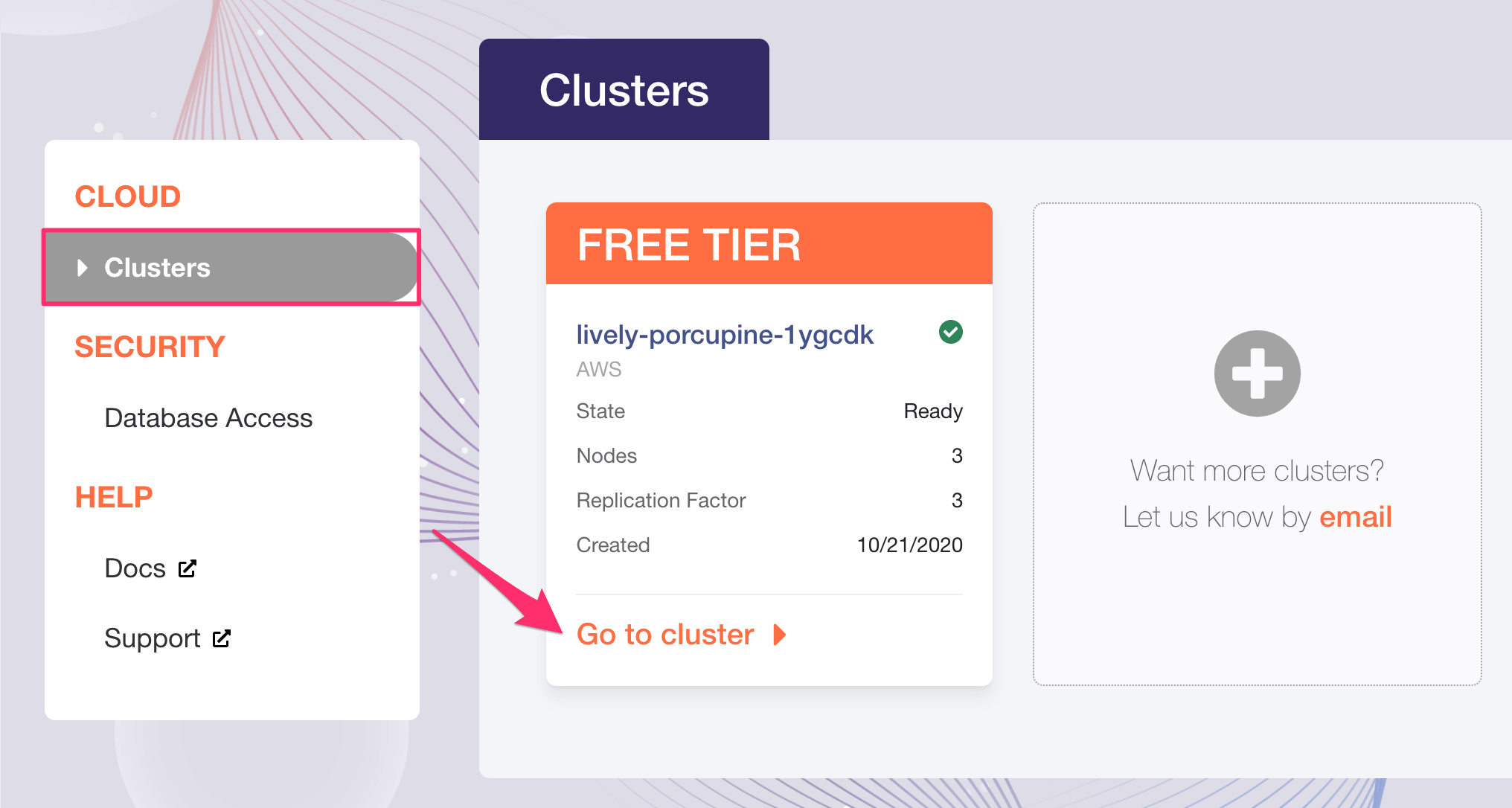 To get it, click on your cluster on the cluster dashboard: