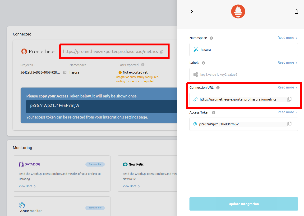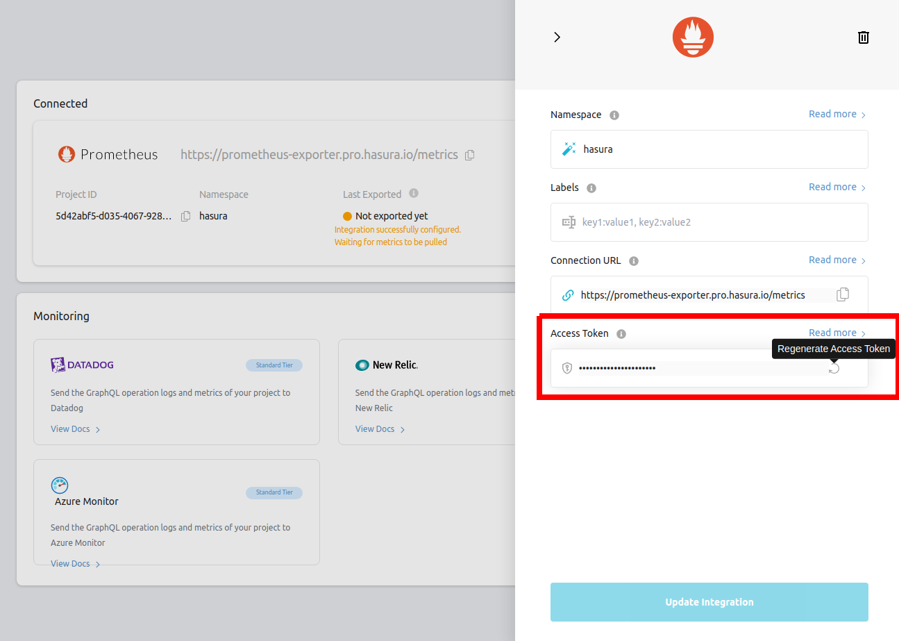 The Access Token is generated once the Integration is created. The token is showed only once and cannot be retrieved again. Access token is used as the password for Basic Authentication by the Prometheus Agent.