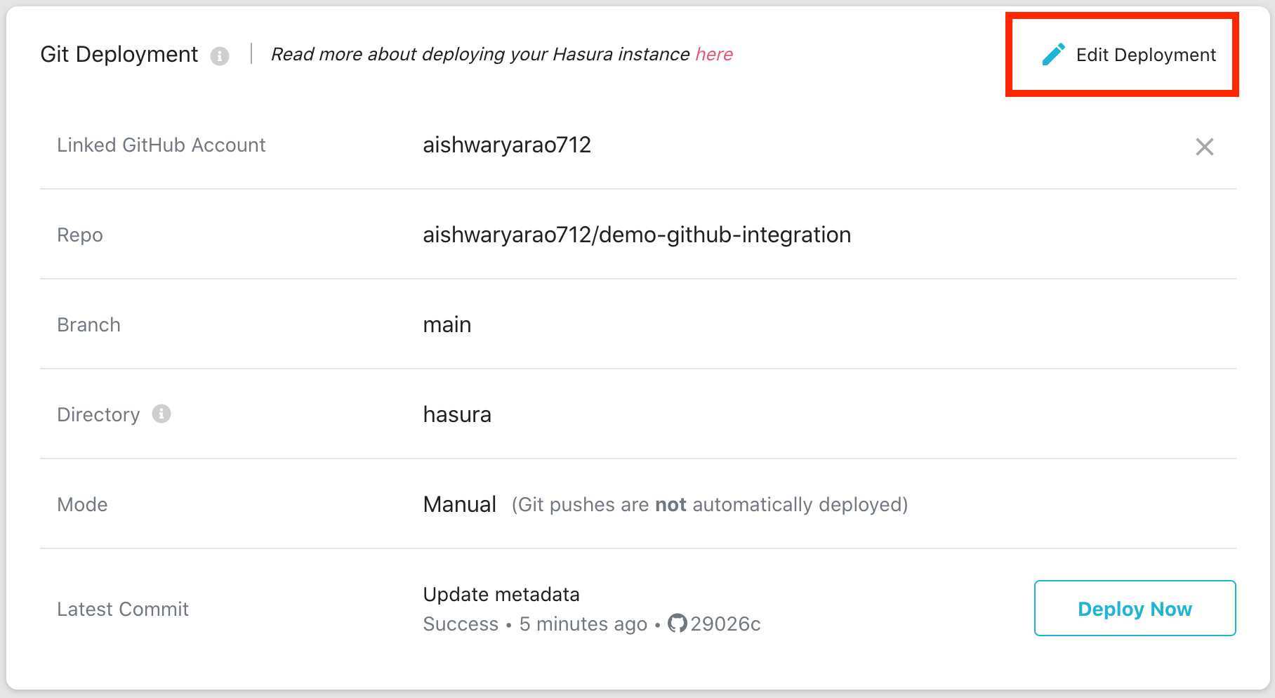 Hasura Cloud project. The details for the integration can be viewed in the Git Deployment