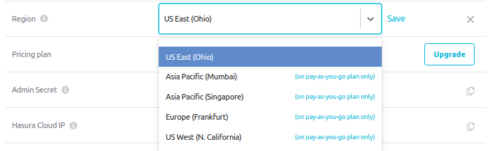 You can deploy Hasura Cloud projects in one of the supported regions (more regions are coming soon). A project’s region of deployment can be selected while creating the project and it can be changed later from the project details.