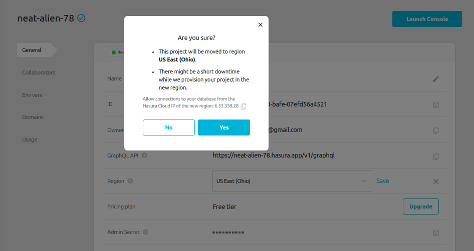 There might be a short downtime while your project is being moved to a different region. If your database allows connections only from specific IP addresses, make sure you add the Hasura Cloud IP of this new region to the list of allowed IP addresses.