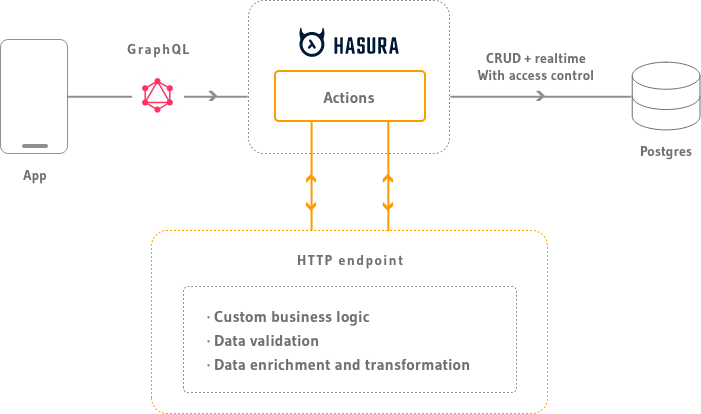 Actions are a way to extend Hasura’s schema with custom business logic using custom queries and mutations. Actions can be added to Hasura to handle various use cases such as data validation, data enrichment from external sources and any other complex business logic.