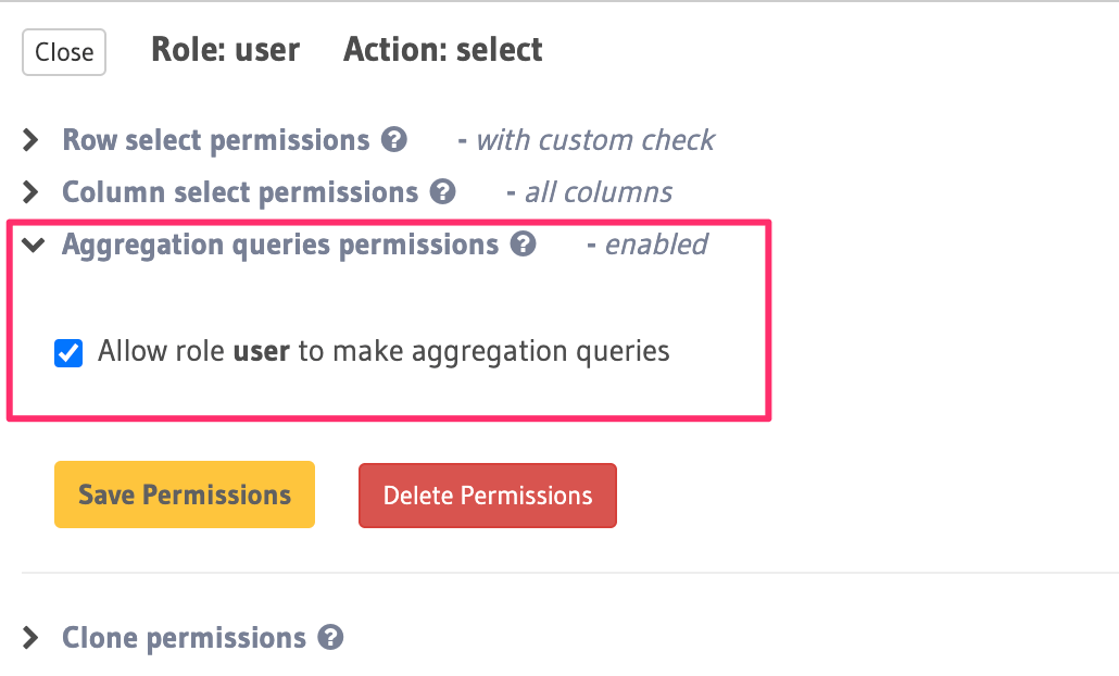 Let’s take a look at the different configuration options available to define a permission rule. Permission rules are defined for each role, table, operation (insert, select, update, delete) by using the console or the metadata APIs for permissions.