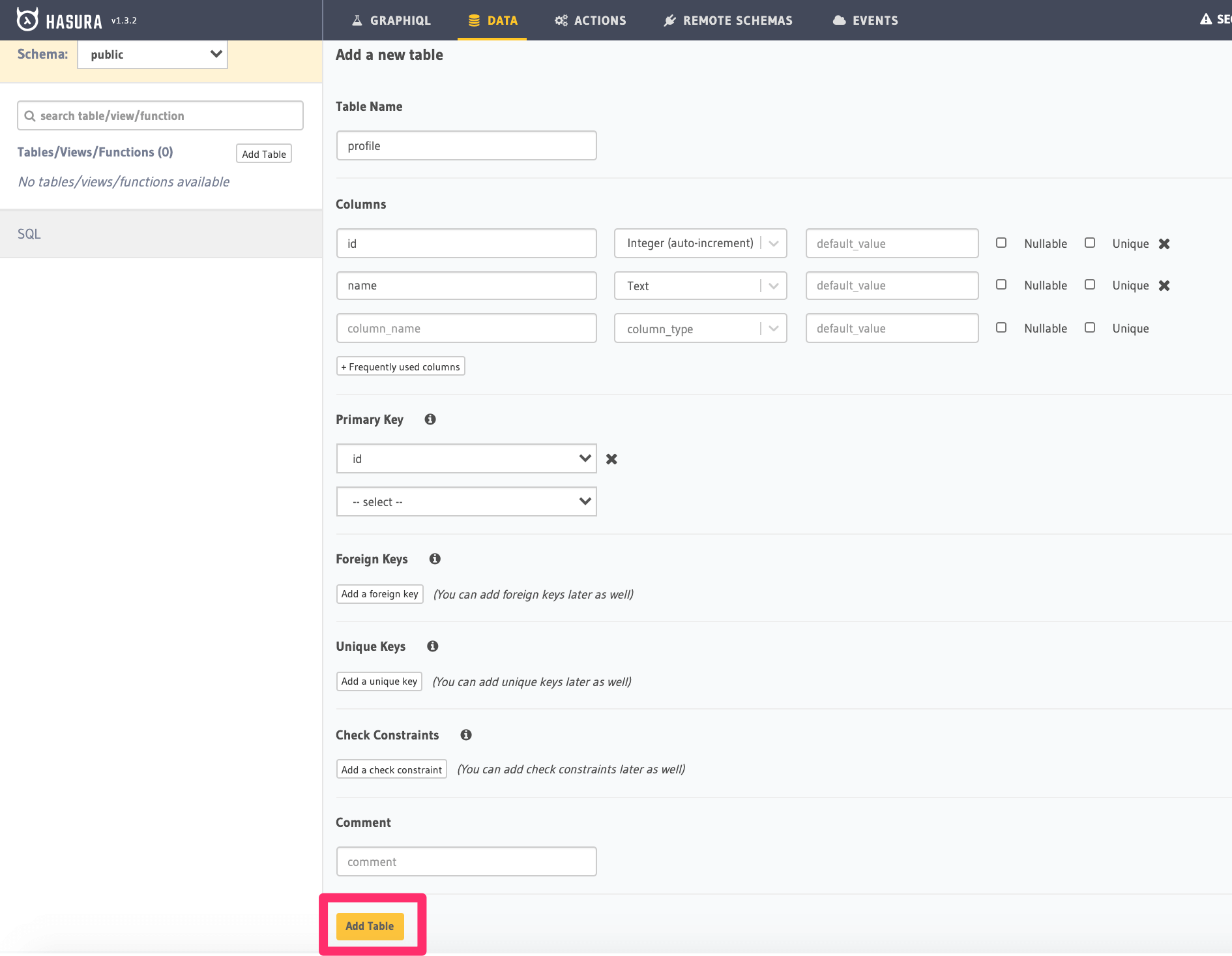as the Primary key and click the Add Table