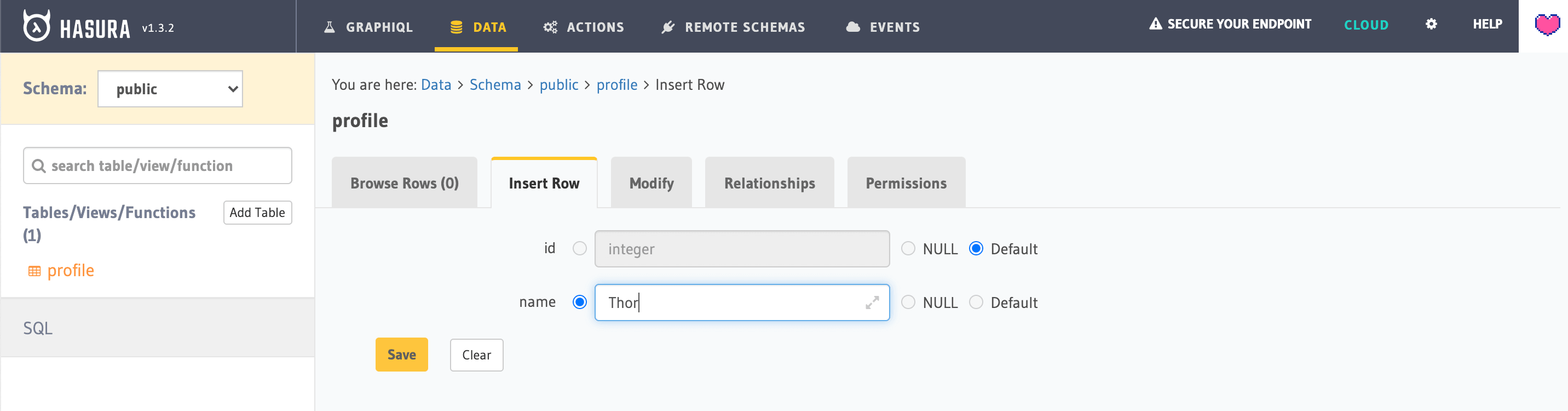 Once the table is created, go to the Insert Row