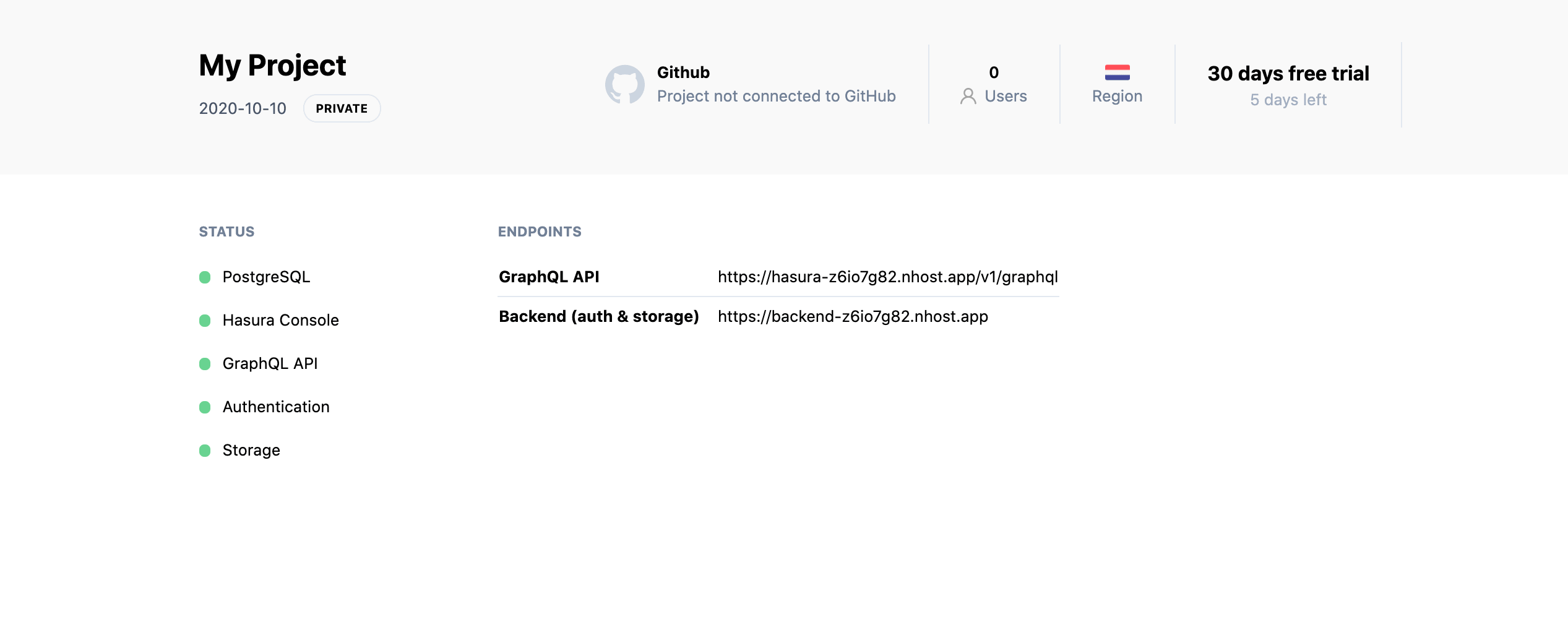 Make sure to create an Nhost account first. Nhost offers a 30-day trial with its starter plan.