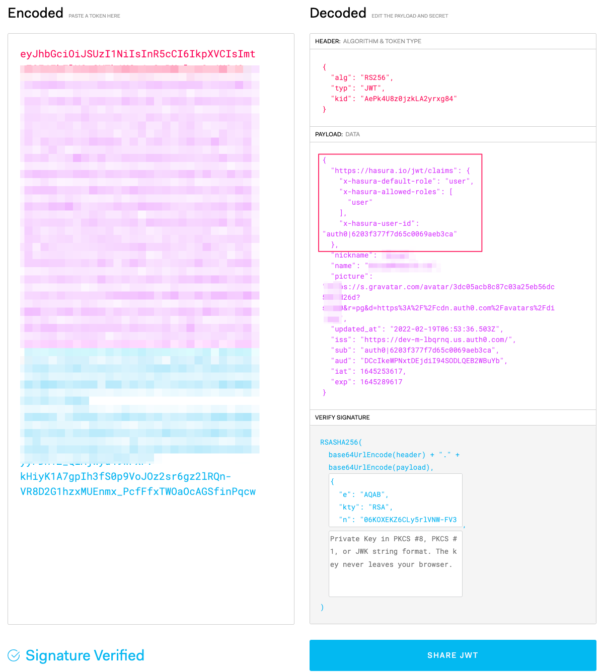Save this JWT token value to be used later to test authorization using the Hasura console.