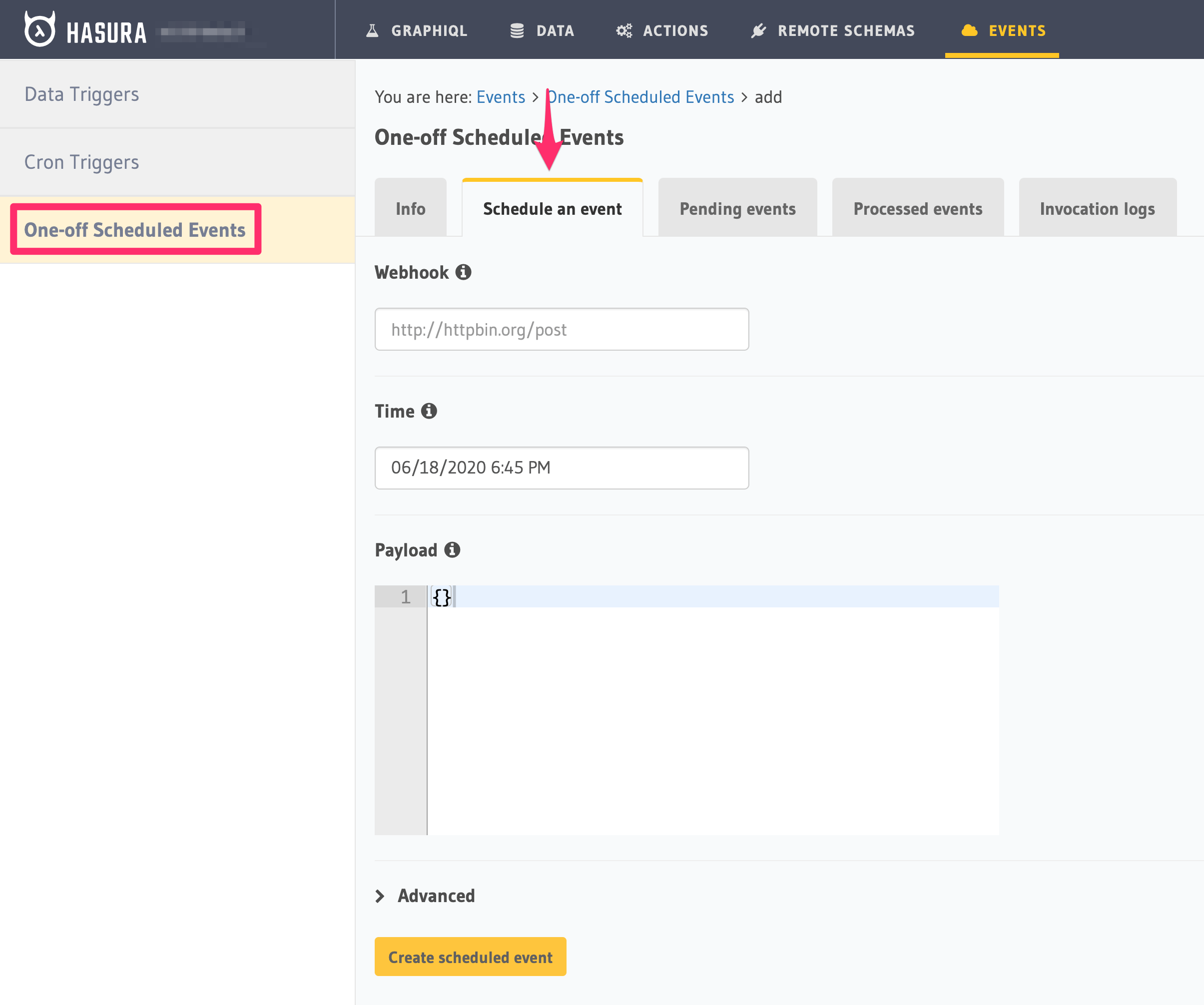 One-off scheduled events are used to reliably trigger an HTTP webhook to run custom business logic at a particular point in time. For example, you can create a scheduled event to send a reminder email two weeks after a user signs up.